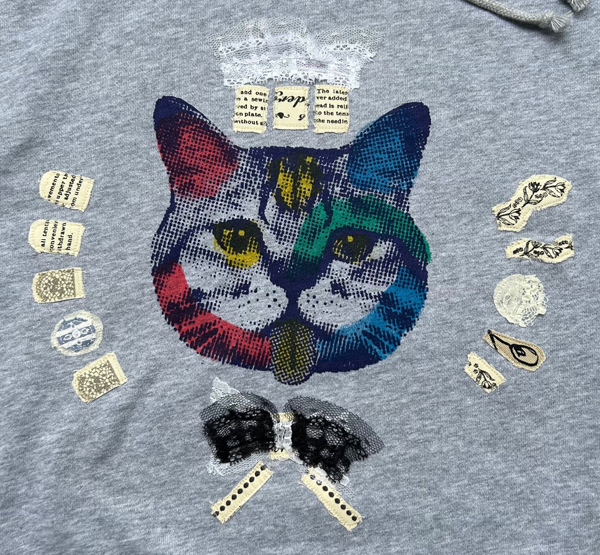 このパーカーはプリントと手描きのグラフィティに加えて手作業による刺繍を施しました。ワンオフ(一点物)の特別な一品をぜひどうぞ